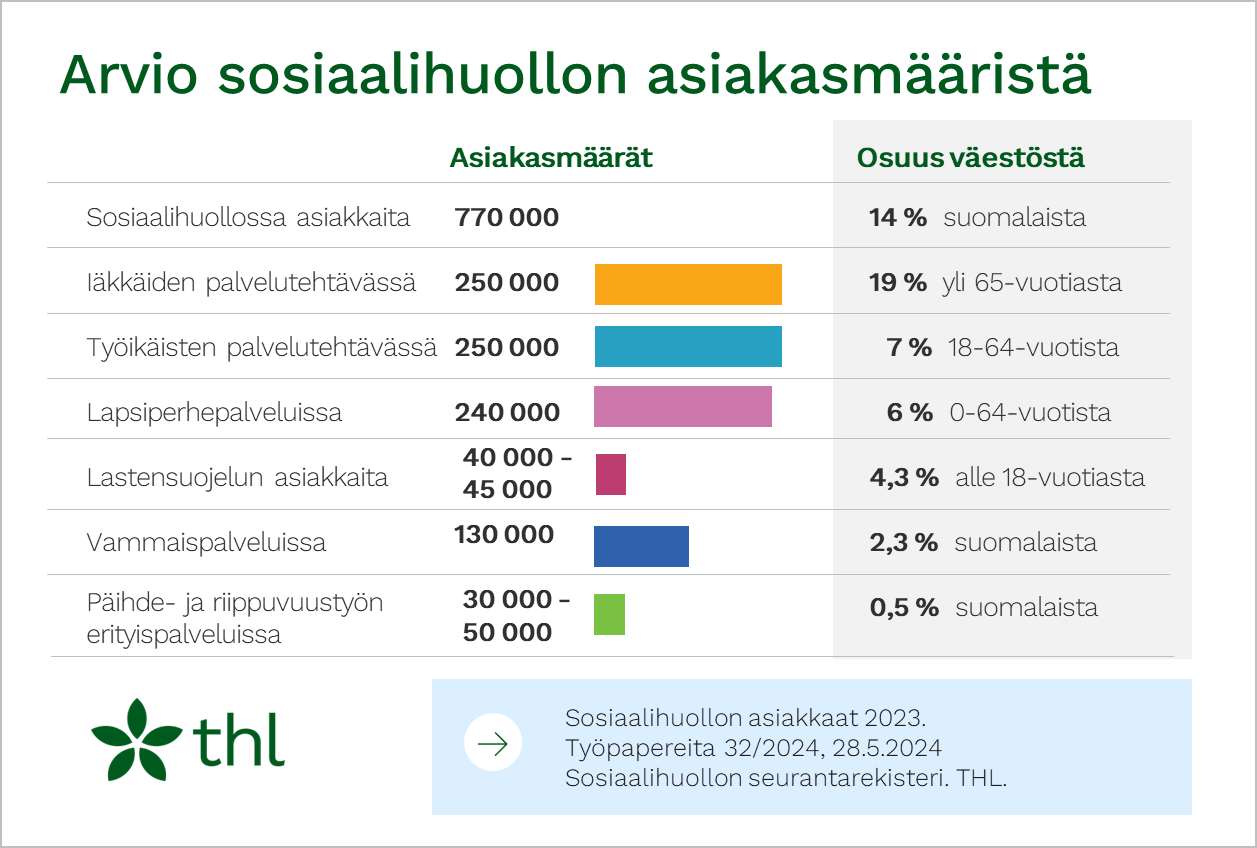 Noin 770 000 ihmistä käyttää sosiaalihuollon palveluita Suomessa. Terveyden ja hyvinvoinnin laitos (THL) on julkaissut ensimmäistä kertaa arvion sosiaalihuollon palveluita käyttävien kokonaismäärästä. Arvio perustuu Sosiaalihuollon seurantarekisterin tietoihin.