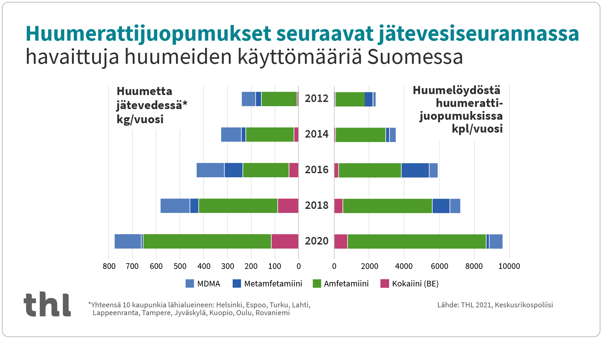 THL:n jätevesitutkimukset osoittavat, että amfetamiinin käyttö on Suomessa edelleen lisääntynyt. Sen sijaan kokaiinin käytön kasvu on tasaantunut ja ekstaasin käyttö vähentynyt. Liikenteessä todetut huumerattijuopumukset seuraavat jätevesiseurannassa havaittuja huumeiden käyttömääriä.