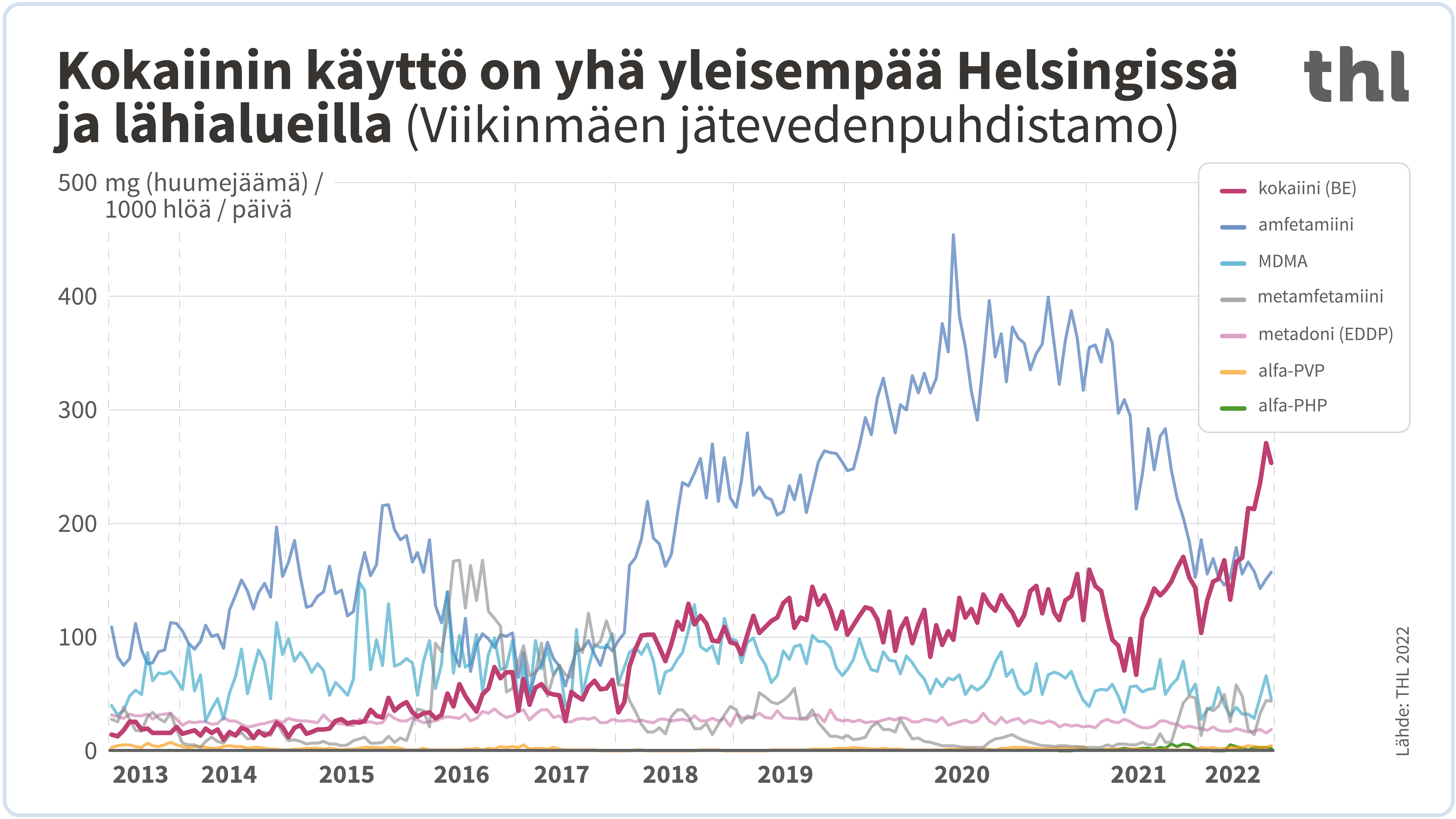 ”Amfetamiinin käytöllä on perinteisesti ollut keskeinen merkitys koko huumetilanteen kannalta Suomessa. Tänä kesänä käytetyn kokaiinin määrä ylitti kuitenkin amfetamiinin ensimmäistä kertaa pääkaupunkiseudulla viikonloppuisin”, toteaa yksikönpäällikkö Teemu Gunnar THL:stä.