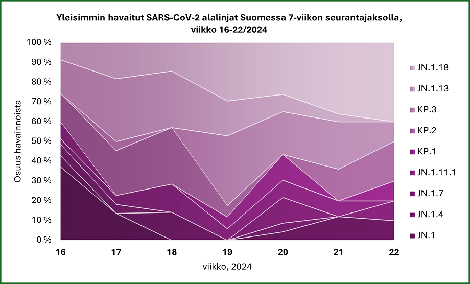 Touko-kesäkuussa genomiseurannassa yleisimmin havaitut muunnokset ovat JN.1.18, KP.3 ja KP.2. Kevään aikana jätevedestäkin on havaittu enää ainoastaan näitä JN.1 ja siitä polveutuvia alalinjoja. Tulokset vastaavat muualla Euroopassa tehtyjä havaintoja.