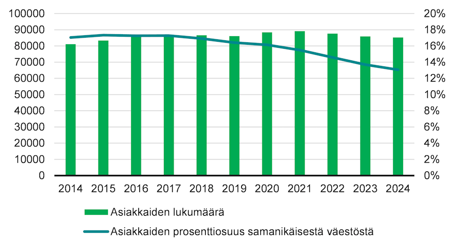 Kotihoidon asiakkaiden määrä väheni vuonna 2024 viidellä prosentilla vuoteen 2023 verrattuna. Vuonna 2024 kotihoidon asiakkaina oli 161 000 henkilöä. Säännöllisen kotihoidon piirissä oli 13 prosenttia 75 vuotta täyttäneistä, mikä on yhden prosenttiyksikön vähemmän kuin vuotta aiemmin. Osuuden lasku ei selity iäkkään väestön kasvulla, koska myös kotihoidon asiakkaiden absoluuttinen määrä on vähentynyt.