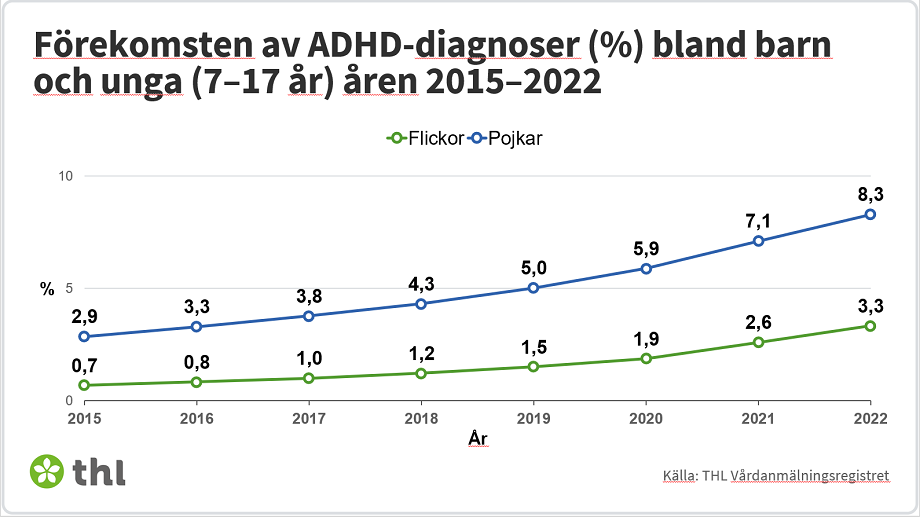 Enligt registeruppgifter från Institutet för hälsa och välfärd (THL) hade 2,9 procent av pojkarna i åldern 7–17 en ADHD-diagnos år 2015; år 2022 hade andelen diagnostiserade pojkar ökat till 8,3 procent. Bland flickor ökade ADHD-diagnoserna från 0,7 procent till 3,3 procent under samma period.