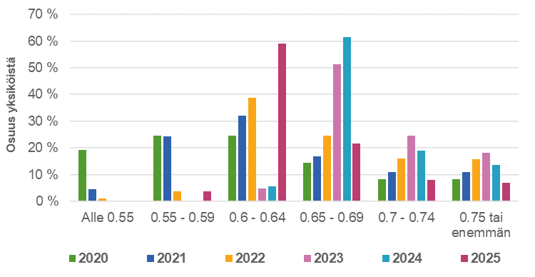 Lakisääteinen vähimmäismitoitus oli nykyisellä (0,6) tasolla viimeksi vuonna 2022. Lähelle vähimmäismitoituksen 0,6 rajaa sijoittuvia yksiköitä on nyt enemmän kuin vuonna 2022. Yksiköitä, jotka ylittävät mitoituksen 0,65 tai 0,7 on vastaavasti aiempaa vähemmän.