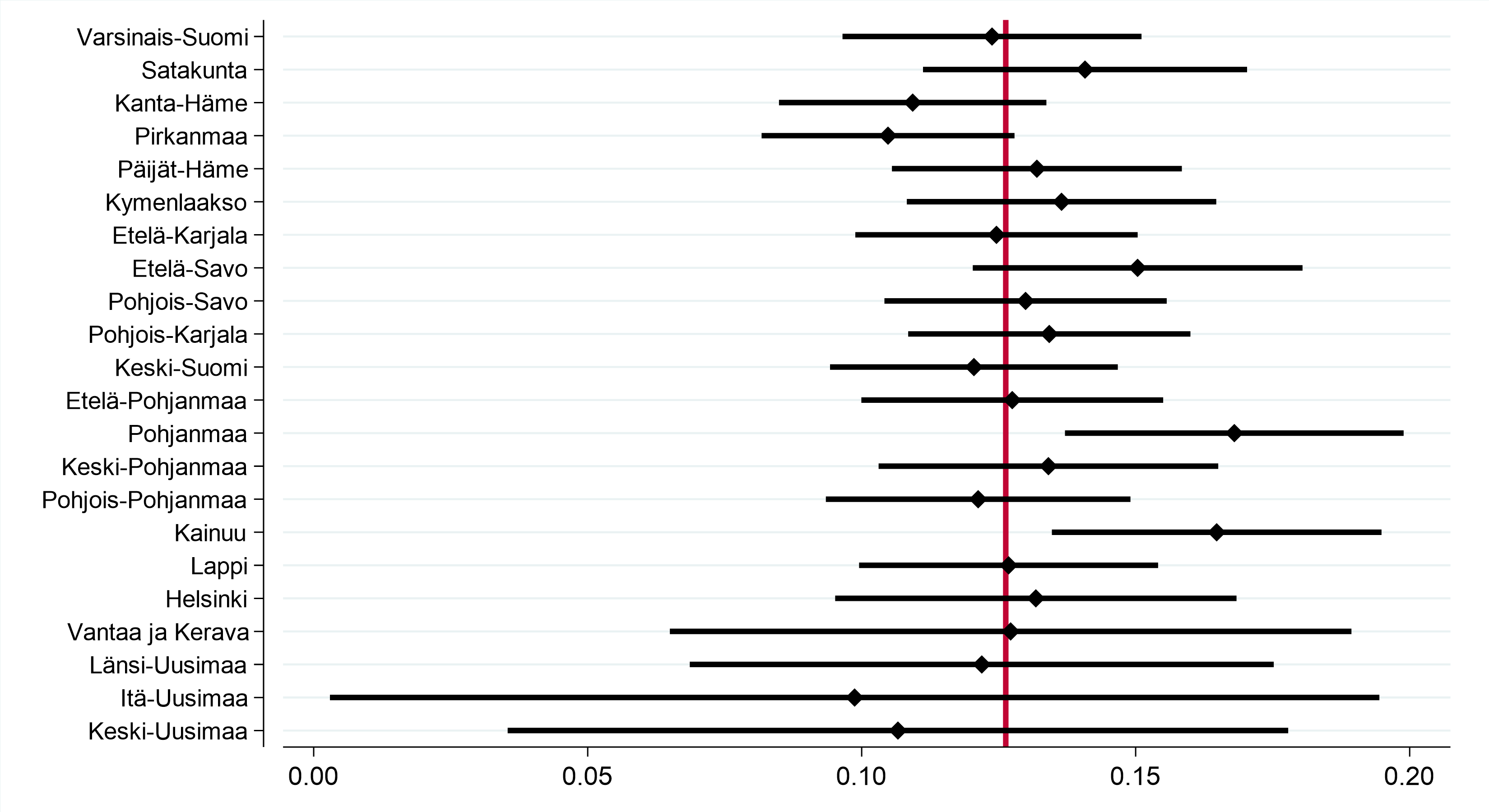 Tyydyttämätöntä lääkäri- ja hoitajapalvelujen tarvetta kokeneiden osuudet ja 95 prosentin luottamusvälit alueittain. Vakioitu ikä, sukupuoli, sairastavuus ja sosioekonomiset tekijät. Klikkaamalla kuva aukeaa isommaksi.