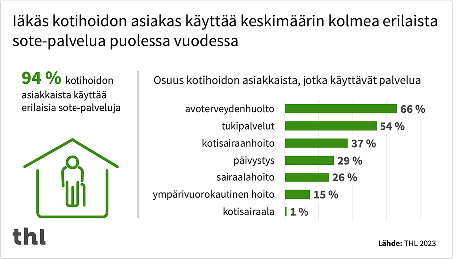 Tutkimuksen mukaan kotihoidon asiakas käyttää puolen vuoden aikana keskimäärin kolmea erilaista sote-palvelua, joita ovat esimerkiksi terveyspalvelut, sosiaalihuollon tukipalvelut ja ympärivuorokautinen hoito.