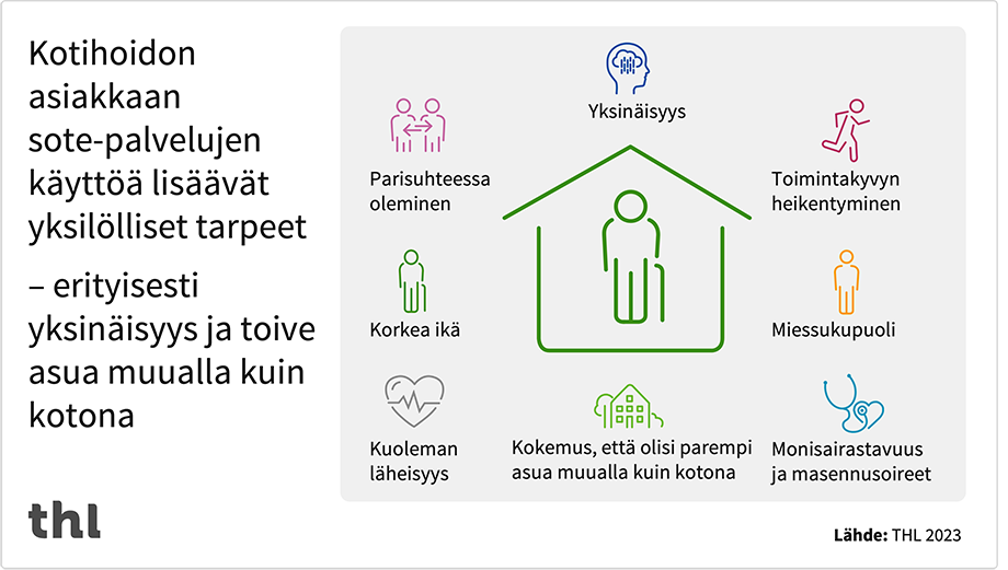 Yksinäisyys ja toive muualla asumisesta lisäävät asiakkaiden sote-palvelujen käyttöä enemmän kuin muut tutkimuksessa tarkastellut terveyden tai elämäntilanteen osa-alueet. Palvelujen käyttöä lisäävät osaltaan myös korkea ikä, miessukupuoli, parisuhteessa oleminen, yksin asuminen, terveyden ja toimintakyvyn vajeet sekä kuoleman läheisyys.