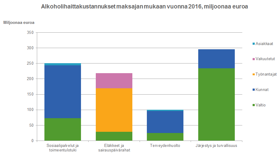Valtaosa välittömistä haittakustannuksista lankeaa julkisen sektorin maksettaviksi. Vuonna 2016 alkoholinkäytön välittömät kustannukset olivat noin 870 miljoonaa euroa. Julkisen sektorin maksettavaksi tuli tästä noin 664 miljoonaa euroa. Sosiaaliturvan piiriin kuuluvat haittakustannukset muodostivat 42 prosenttia julkiselle sektorille aiheutuvista kustannuksista, yleisen järjestyksen ja turvallisuuden ylläpito 44 prosenttia ja terveydenhuolto noin 15 prosenttia.