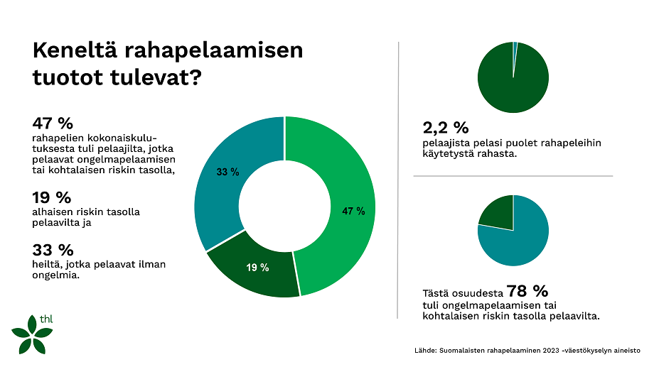 Ylipäätään rahapelien kokonaiskulutuksesta 47 prosenttia tuli pelaajilta, jotka pelaavat ongelmapelaamisen tai kohtalaisen riskin tasolla, 19 prosenttia alhaisen riskin tasolla pelaavilta ja 33 prosenttia heiltä, jotka pelaavat ilman ongelmia.