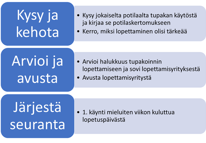 - Kysy tupakka- ja nikotiinituotteiden käytöstä jokaiselta potilaalta jokaisella käynnillä (vähintään kerran vuodessa). Kirjaa tiedot potilastietoihin.