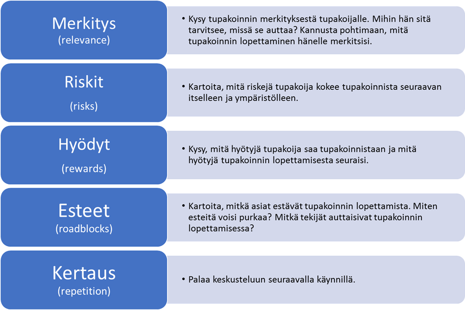 - Mikäli potilas ei ole halukas lopettamaan, voit käyttää keskustelun apuna "viiden R:n" mukaista motivoivaa keskustelua.