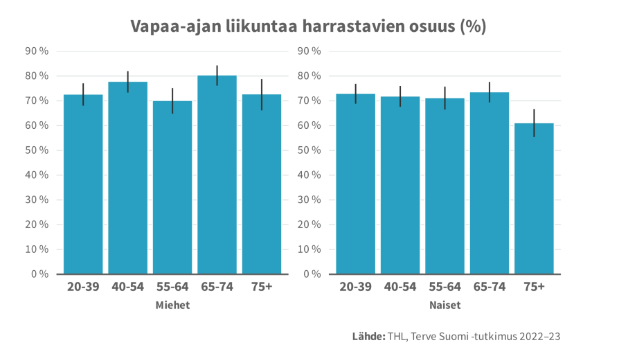 Kolme neljästä suomalaisesta kertoo kuitenkin liikkuvansa vapaa-ajallaan edes jonkin verran. Vapaa-ajalla esimerkiksi kävellään, pyöräillään, kalastetaan, metsästetään tai tehdään kevyitä puutarhatöitä. Harvimmin liikuntaa harrastavat 75 vuotta täyttäneet naiset (61 %).