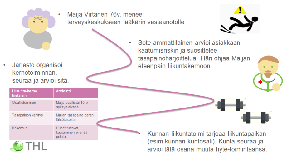 - sosiaali- ja terveystoimessa tai sen palveluntuottaja-organisaatiossa työskentelevä sote-ammattilainen arvioi asiakkaan kaatumisriskin ja suosittelee tasapainoharjoittelua