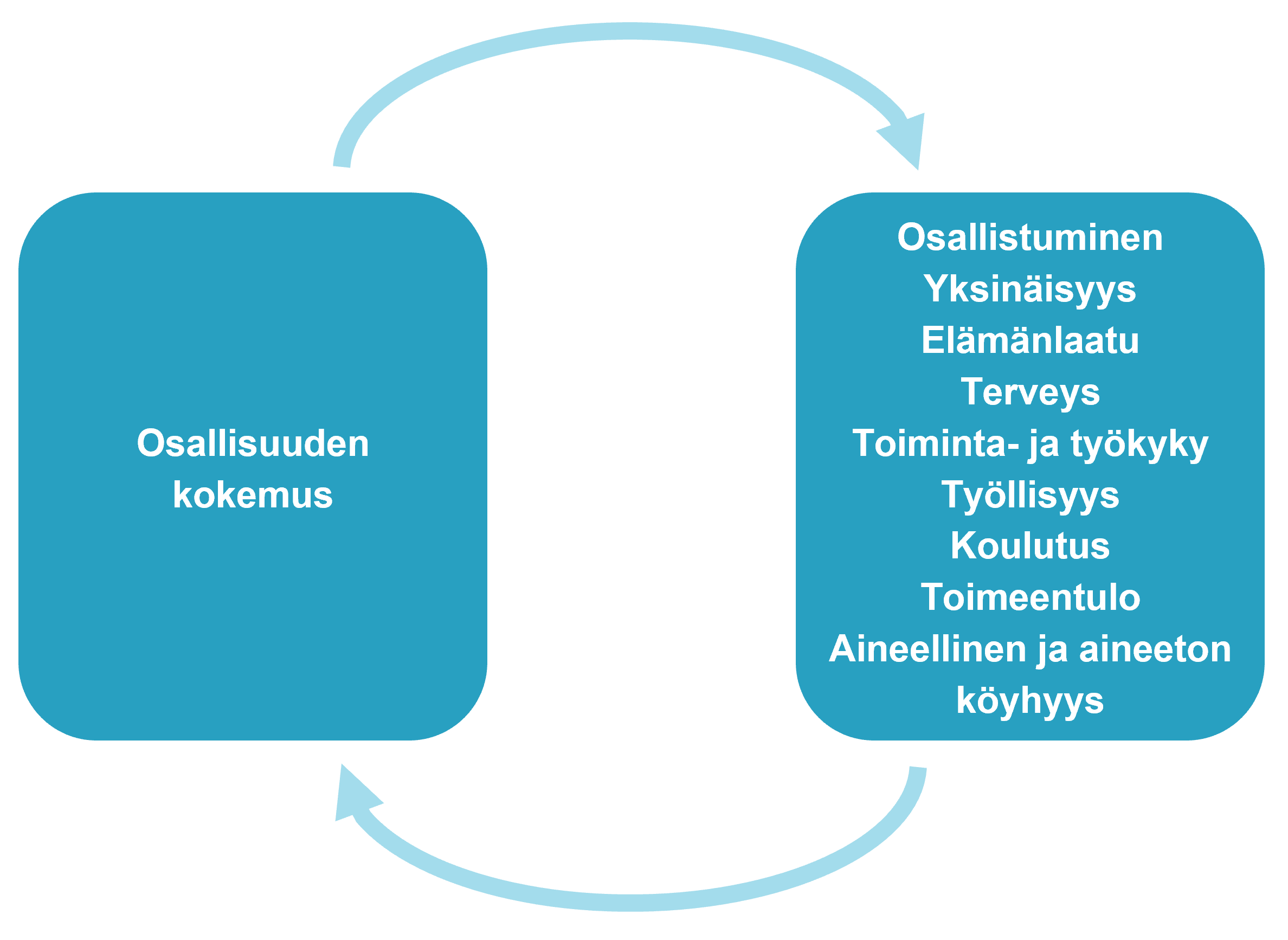 Samanlainen vuorovaikutussuhde muodostuu myös osallisuuden kokemuksen ja yksilön hyvinvoinnin ja terveyden välillä. Erityisesti yhteys mielenterveyteen on vahva. Heikentynyt mielenterveys on suurin työkyvyttömyyttä aiheuttava syy. Toisaalta heikentynyt terveys kasvattaa sosiaali- ja terveyspalveluiden tarvetta.