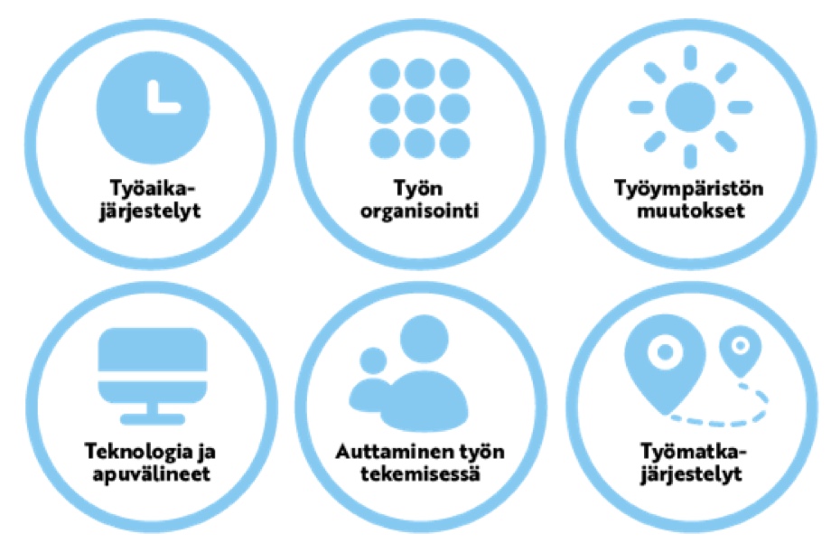 - Työn uudelleen organisointi, esimerkiksi työtehtävien rajaaminen