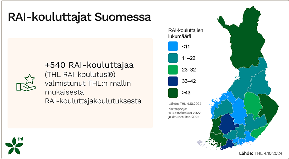 THL:n RAI-kouluttajakoulutus antaa sote-ammattilaiselle valtuudet toimia RAI-kouluttajana (THL RAI-koulutus®). RAI-kouluttajalla on tiedot ja työvälineet toteuttaa työyhteisössään koulutuksia, jotka edistävät kansallisesti yhtenäistä RAI-arviointiosaamista iäkkäiden palveluissa.