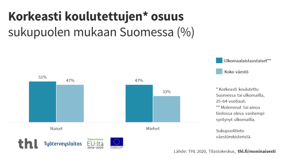 Ulkomaalaistaustaiset naiset ovat kaikista korkeimmin koulutettuja (51 %) verrattuna koko väestön naisiin (47 %) ja miehiin (33 %) sekä ulkomaalaistaustaisiin miehiin (47 %).