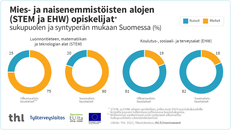 Luonnontieteen, matematiikan ja teknologian aloja (STEM) opiskelevista ulkomaalaistaustaisista naisia on 25 prosenttia ja suomalaistaustaisista naisia on 20 prosenttia. Koulutus-, sosiaali- ja terveysaloja (EHW) opiskelevista ulkomaalaistaustaisista miehiä on vain 19 prosenttia ja suomalaistaustaisista miehiä on ainoastaan 18 prosenttia.