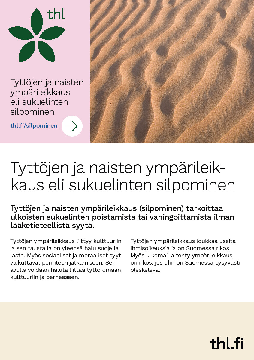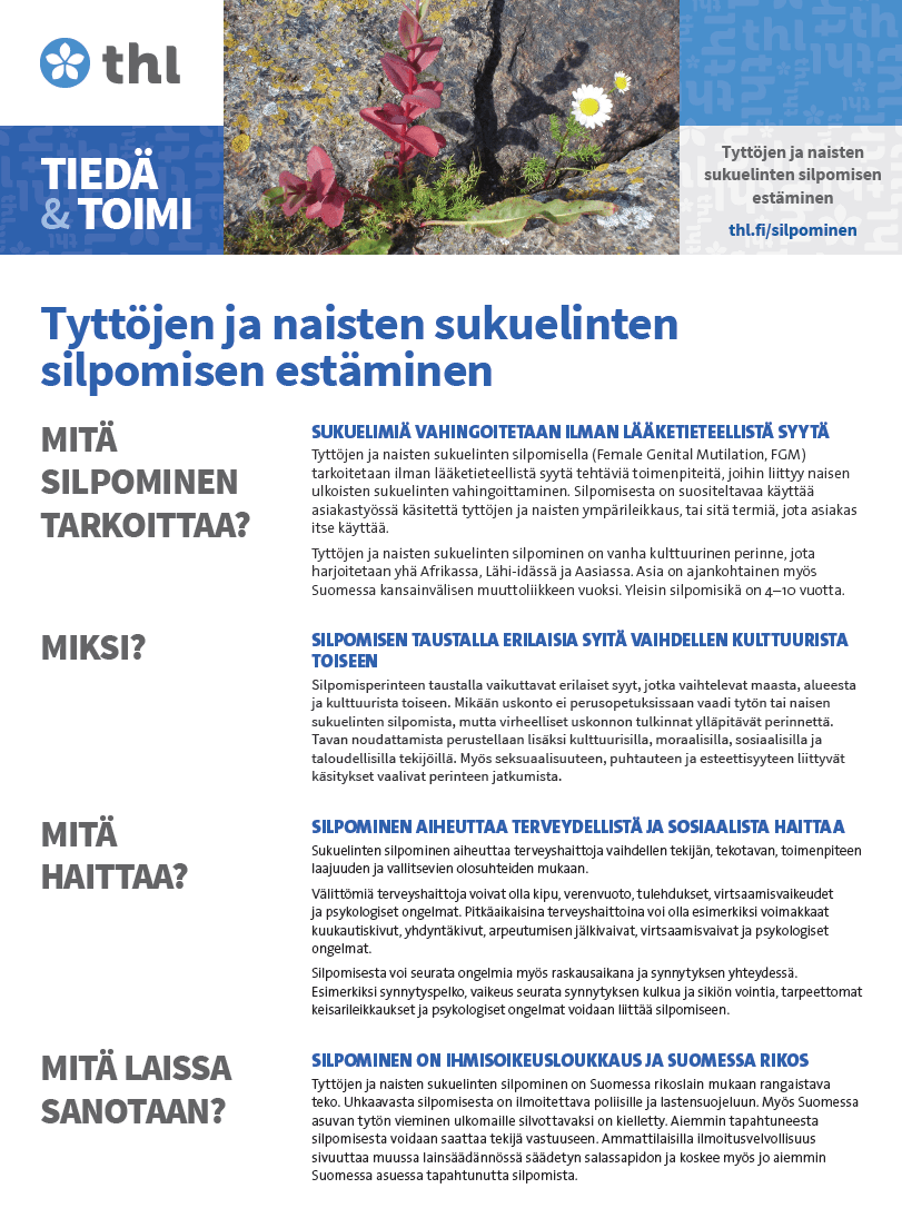 Tämä sivusto tarjoaa tietoa tyttöjen ja naisten silpomisperinteestä ja ohjeet ehkäisevään käytännön työhön. Sivusto on tarkoitettu maahanmuuttajataustaisten lasten, nuorten ja perheiden parissa työskenteleville ammattilaisille.