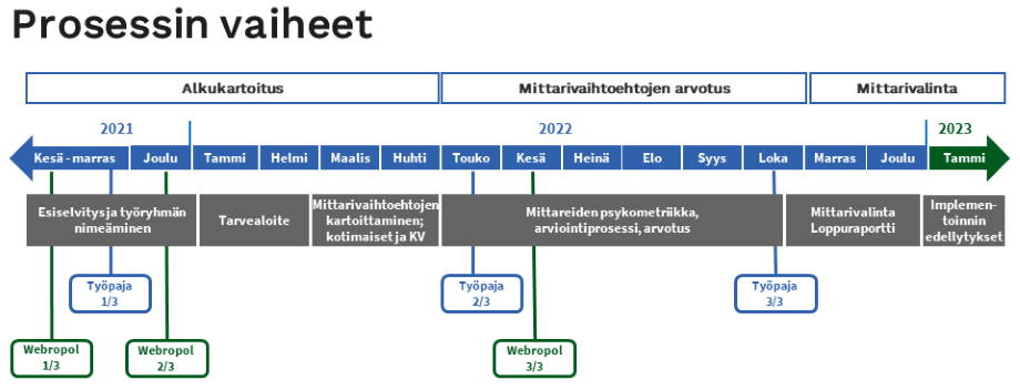 - Helmi-elokuussa 2022 rajattiin tarkasteluun valittavien mittarien määrää ja arvotettiin ne (mm. luotettavuus, toistettavuus ja pätevyys).