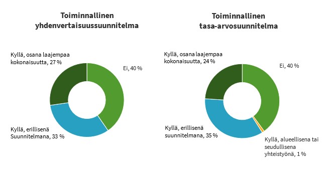 Kuntajohdon tiedonkeruun mukaan 60 prosentilla kunnista on suunnitelma tasa-arvon ja yhdenvertaisuuden edistämiseksi kunnan toiminnassa ja kuntalaisten palveluissa. Henkilöstöä koskevat suunnitelmat olivat huomattavasti tätä yleisempiä, ja henkilöstöpoliittisen yhdenvertaisuussuunnitelman oli laatinut 87 prosenttia kunnista ja henkilöstöpoliittisen tasa-arvosuunnitelman 91 prosenttia kunnista.