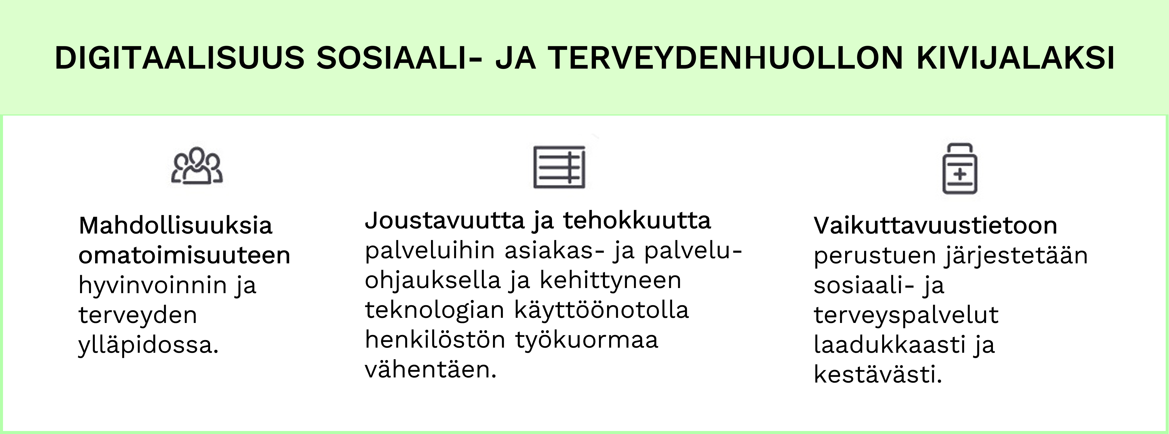 Viitearkkitehtuurissa esitellään kaikki keskeiset sosiaali- ja terveydenhuollon tiedonhallintaan vaikuttavat strategiat, periaatteet ja linjaukset, muun muassa Sosiaali- ja terveydenhuollon digitalisaation ja tiedonhallinnan strategia ja sen visio: Digitaalisuus sosiaali- ja terveydenhuollon kivijalaksi.