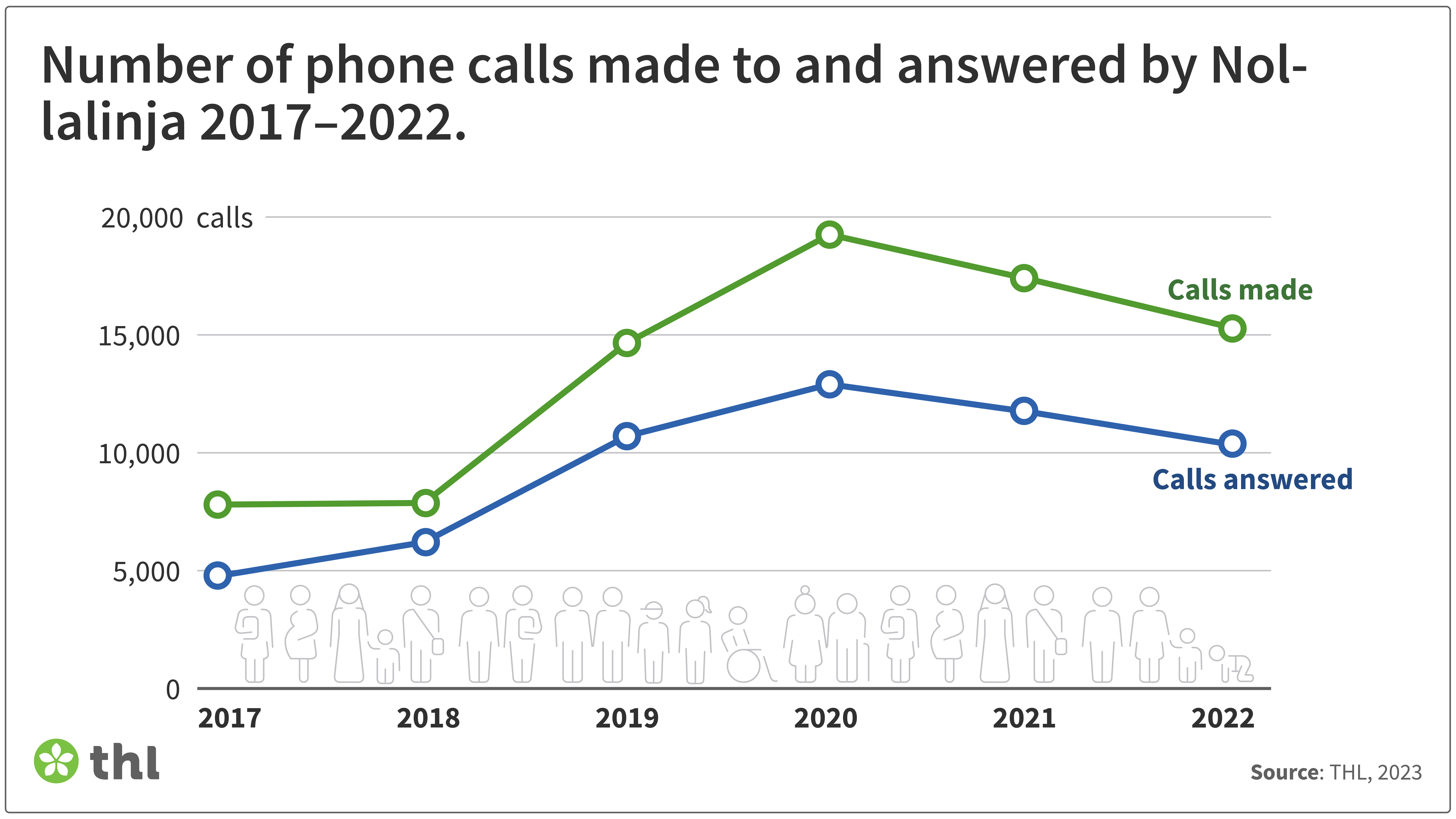 “The Nollalinja helpline received on average 1,280 calls a month. A lot of phone calls were received in the summer and after the summer holidays, while it was more quiet at the beginning and end of the year. Nollalinja was able to answer about two out of three calls. When the helplines were busy, some of the callers did not wait for the lines to be free, so their calls could not be answered. Some of them have probably called again later and received help then,” explains Anu Karhinen-Soppi, Senior Specialist at THL.