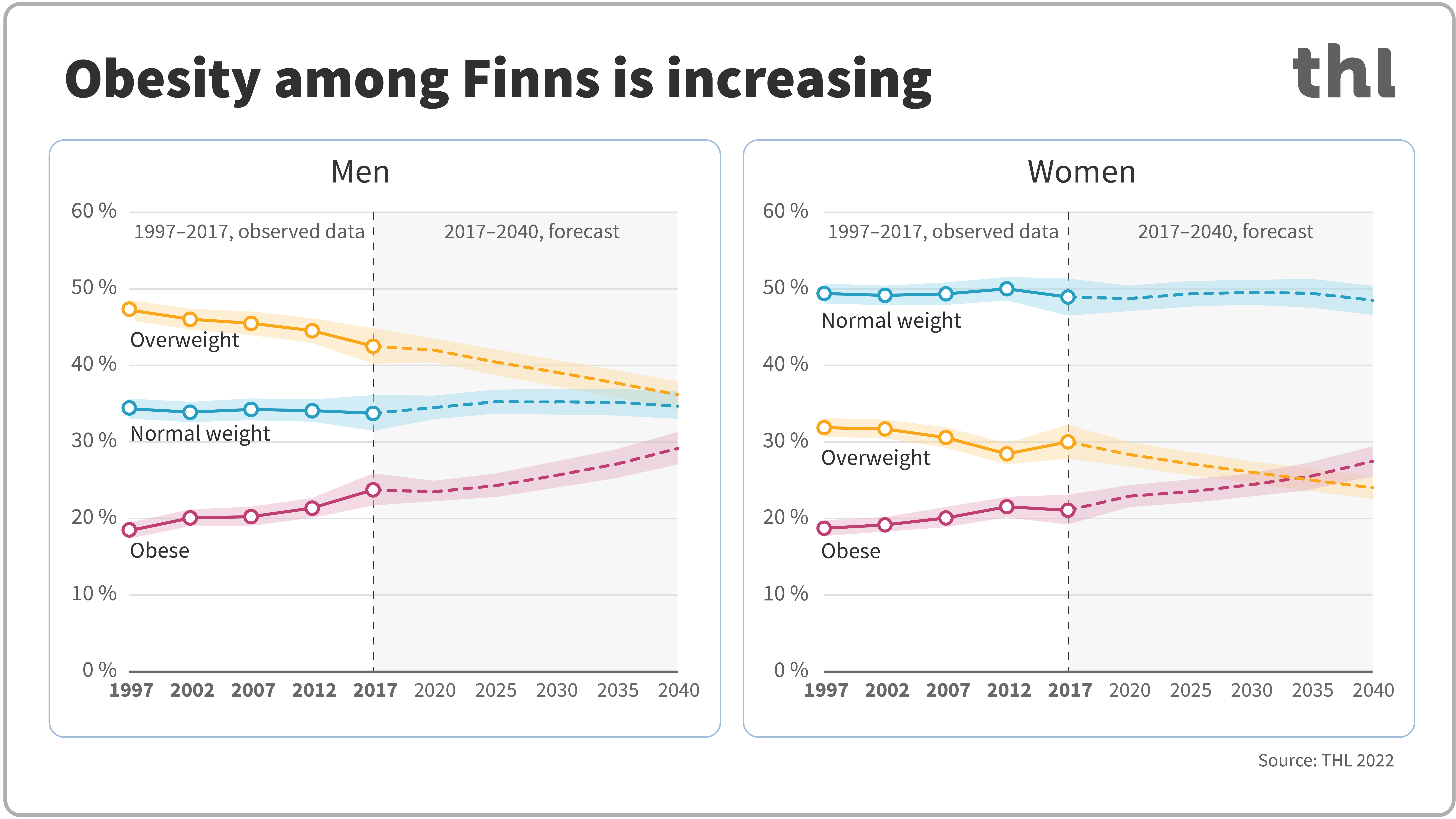 "However, the continuous increase in obesity is a cause for concern. If weight increases among those already overweight, it is likely to affect the spread of, for example, diabetes and other diseases,” adds Tolonen.