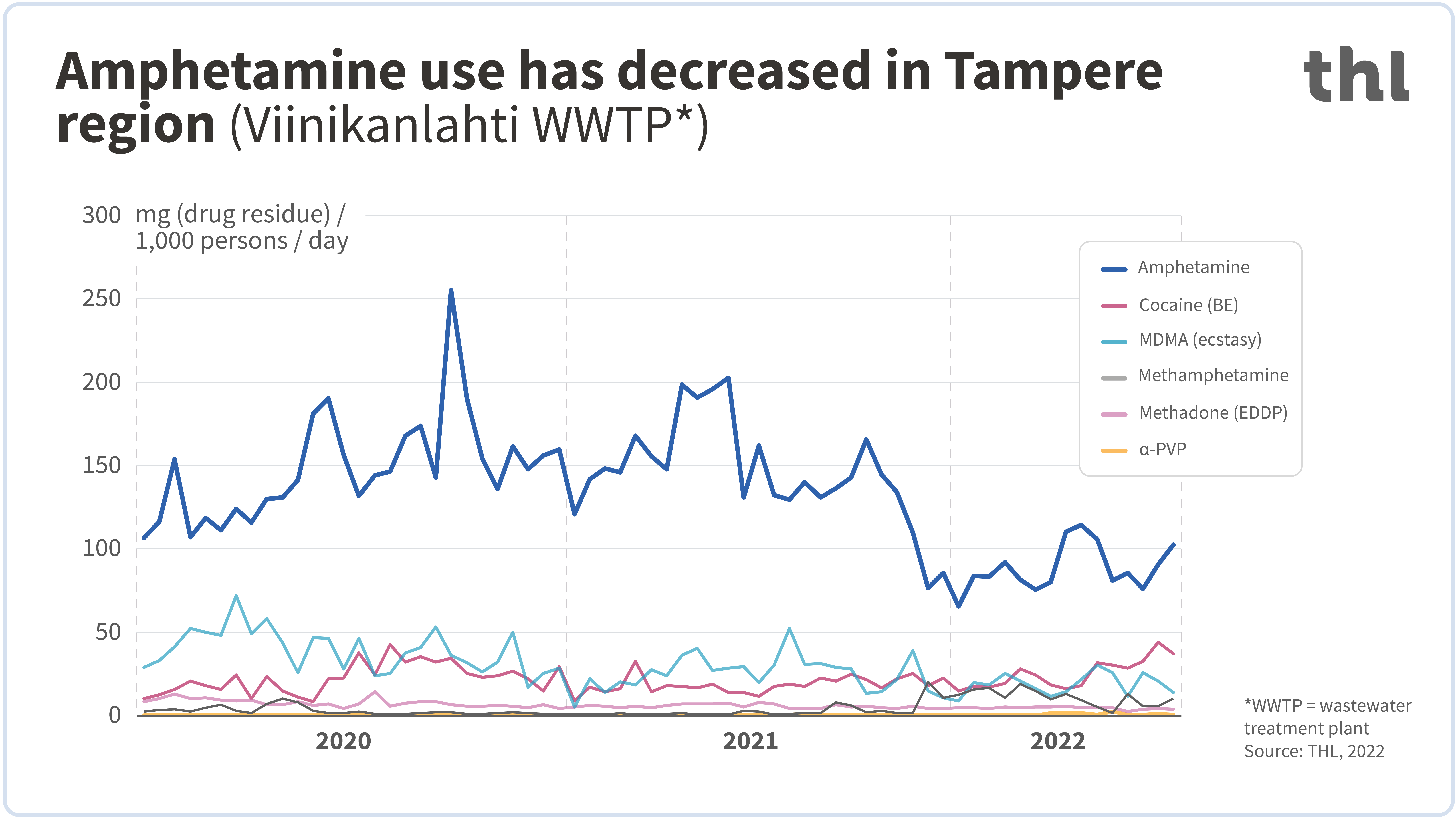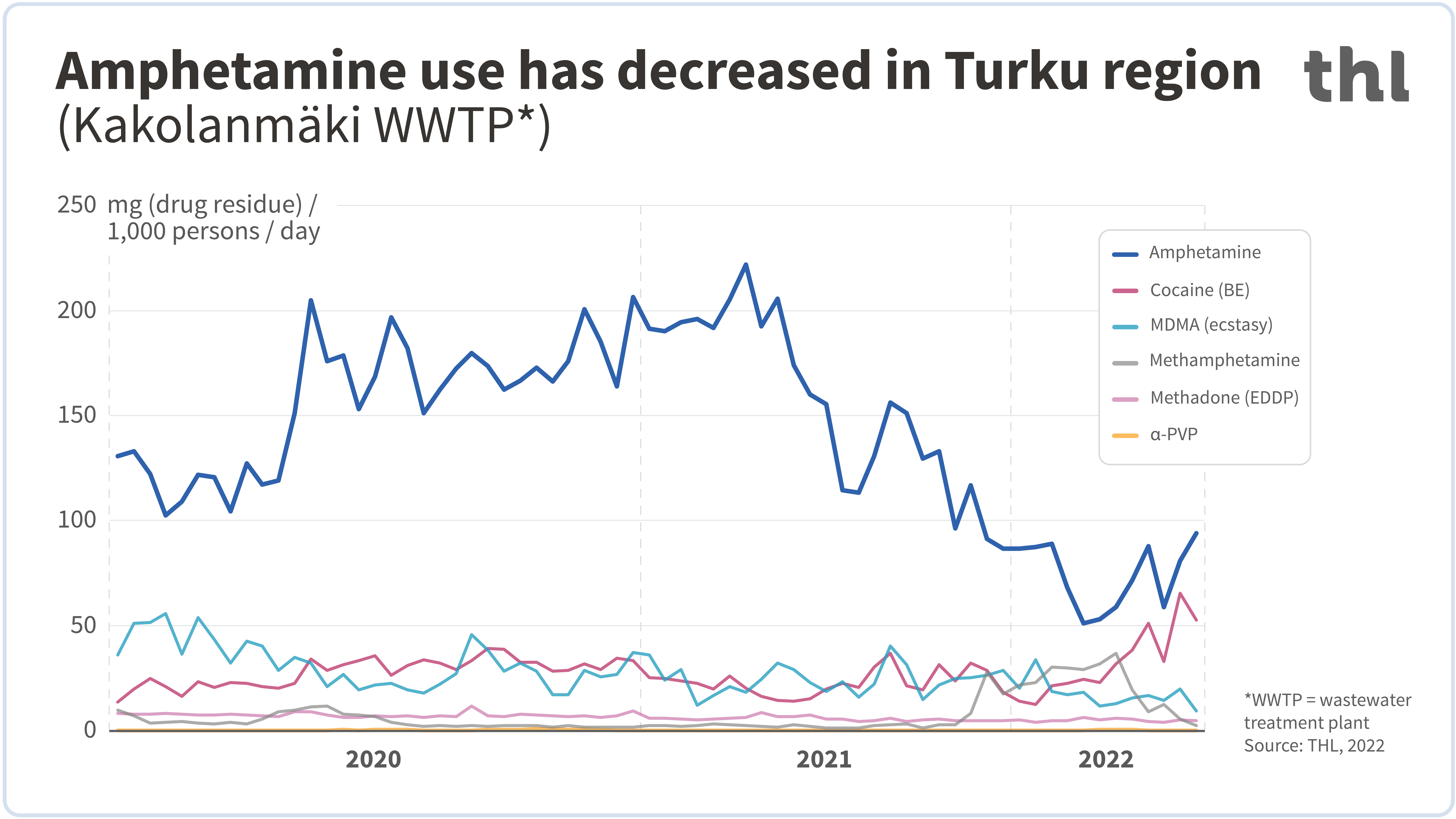 THL’s wastewater study has found that cocaine use has continued to increase in Finland and is increasingly concentrated in the Helsinki Metropolitan Area. Amphetamine, in contrast, is used throughout the country, but national usage levels have remained below the record-breaking level reached in 2020.