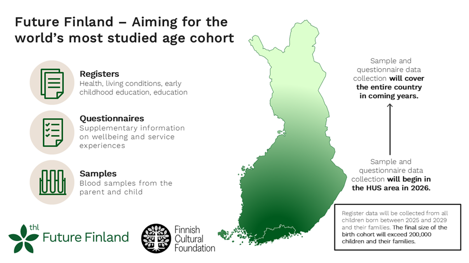 The Future Finland birth cohort will include up to 200,000 children born in Finland between 2025 and 2029, along with their families. It will also include families who move to Finland later, if they have children born during those years.