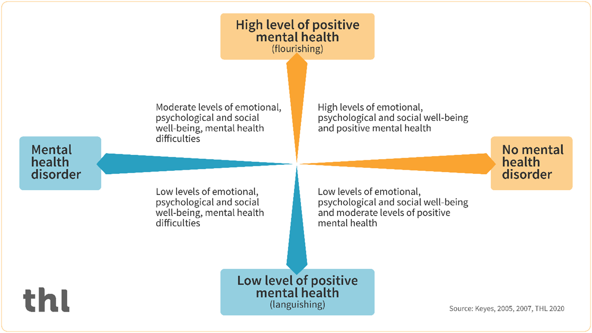 The concept of positive mental health is aimed at moving the focus away from illnesses and problems. It is based on the idea that positive mental health is more than the absence of mental health disorders. Positive mental health can be developed despite the existence of a mental health disorder. The figure below clarifies the diversity of mental health and mental wellbeing.