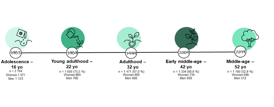 The follow-up study continued in the spring of 2019, when participants were 52 years old. An address was acquired for 2 059 participants and 1 160, or 53 % of baseline participants, took part in the survey.