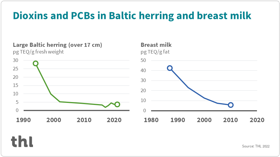 The decrease in the concentrations of environmental pollutants has also resulted in reduced human exposure. THL has monitored the concentrations of dioxins and PCBs in Finnish diet and breast milk since the 1980s, during which time the concentrations have decreased dramatically. However, environmental pollutants will continue to cause concern, since not all pollutants have decreased similarly, and in some cases monitoring data is not available at all.