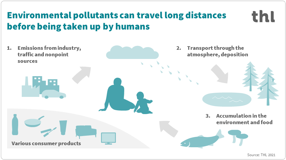 In Finland, people are exposed to environmental pollutants mainly through food, but also through inhalation and sometimes through skin.