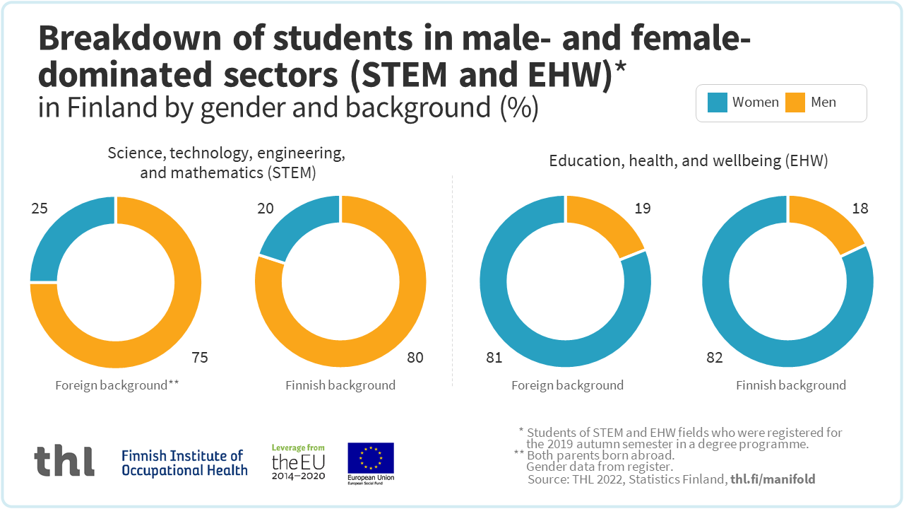 11 percent of women with a Finnish background and 44 percent of men with a Finnish background are studying in STEM fields. 25 percent of women with a foreign background and 6 percent of men with a foreign background are studying in the fields of education, health, and wellbeing (EHW). 22 percent of women with a Finnish background and 5 percent of men with a Finnish background are studying in EHW fields.