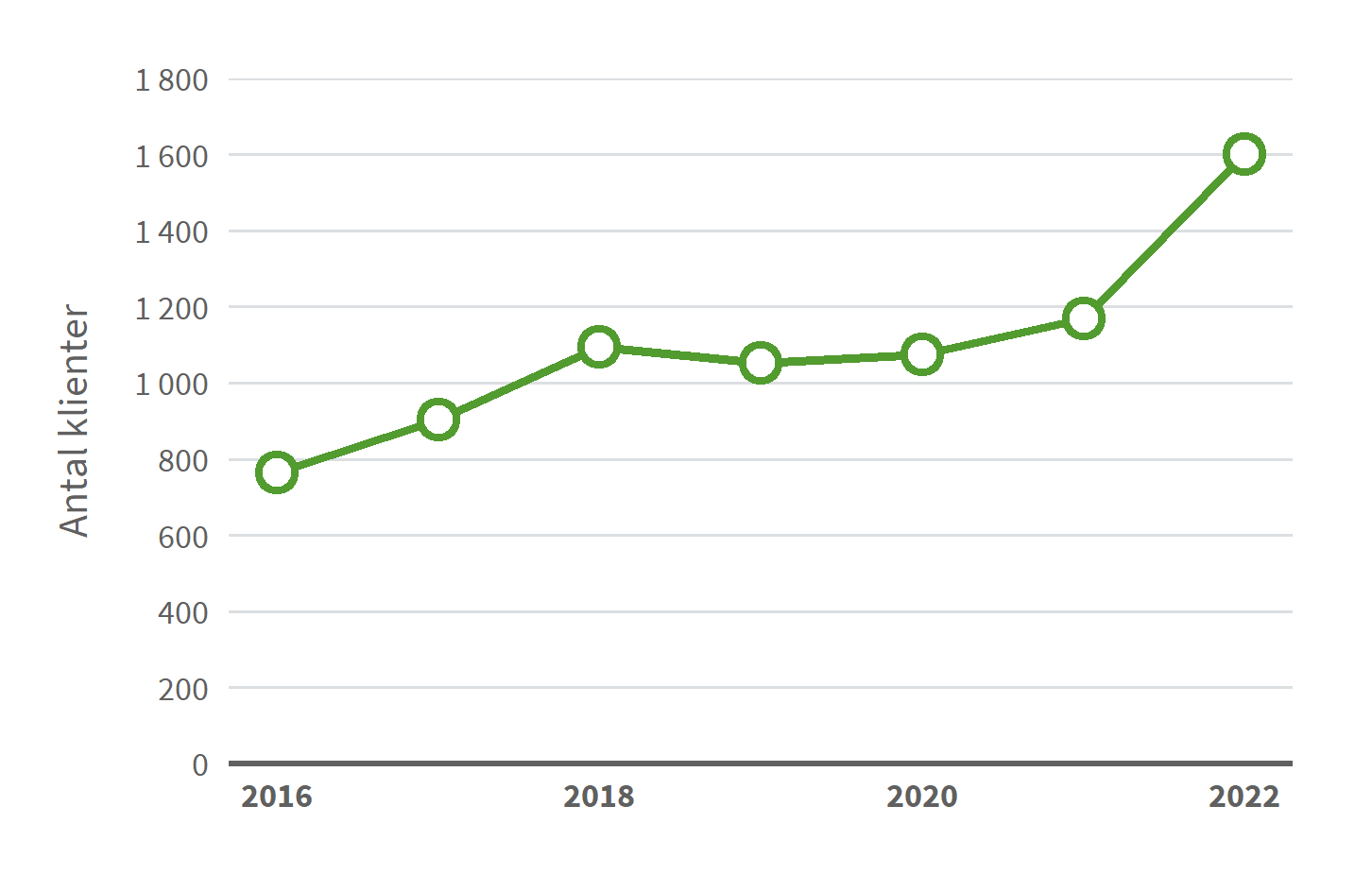 Före coronapandemin ökade antalet klienter på skyddshemmen årligen från och med 2015. Coronan bröt trenden och antalet klienter minskade på skyddshemmen 2020 och 2021.