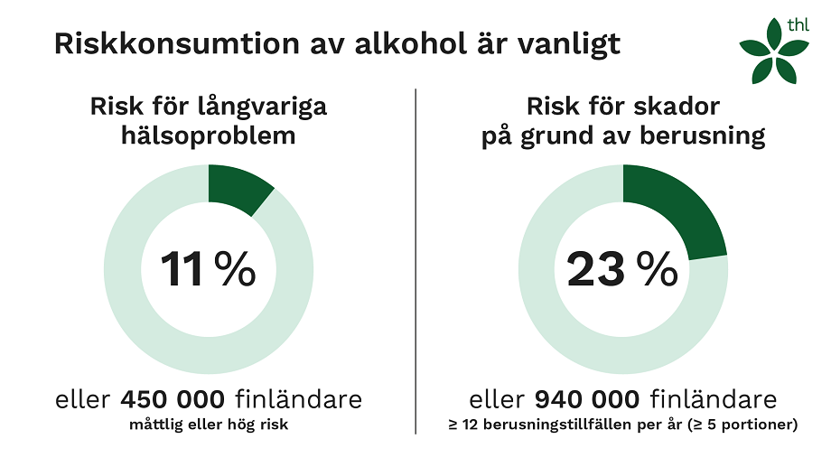 Även om den totala alkoholkonsumtionen i Finland har minskat sedan 2008, är riskkonsumtion fortfarande vanligt förekommande. 11 procent av 20–79-åringarna (450 000 personer) har en förhöjd risk för hälsoproblem orsakade av alkohol. Vid långvarig konsumtion av alkohol är riskgränsen för alkoholrelaterade hälsoproblem mer än 14 portioner alkohol per vecka för män och mer än 7 portioner alkohol per vecka för kvinnor.