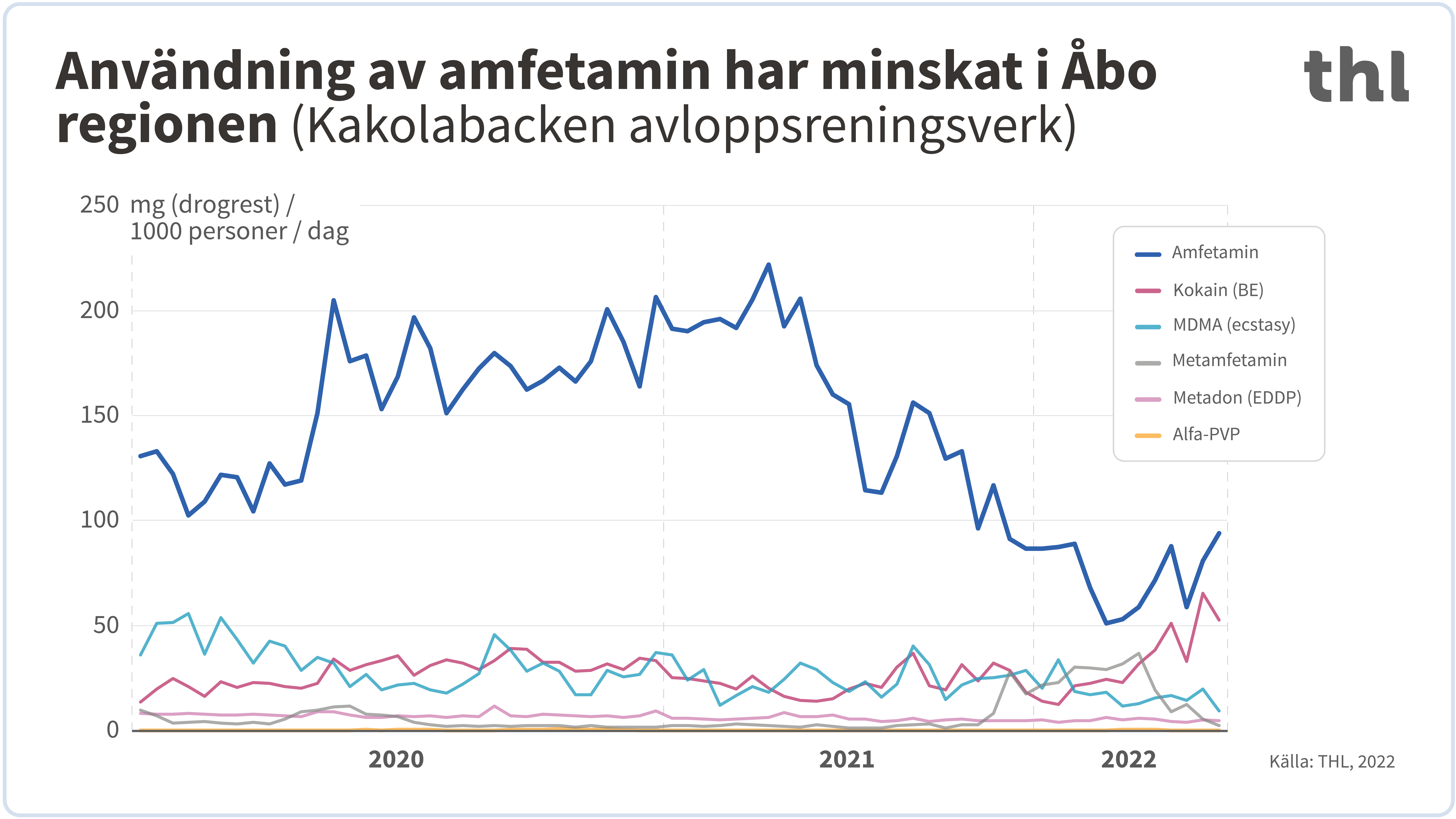 Metamfetamin används för närvarande mycket lite i Finland, även om användningen har ökat något i en del av städerna som deltar i undersökningen. Metamfetaminanvändningen har minskat betydligt sedan 2016 och 2017, då den tillfälligt överskred till och med amfetaminets användningsmängder i huvudstadsregionen.