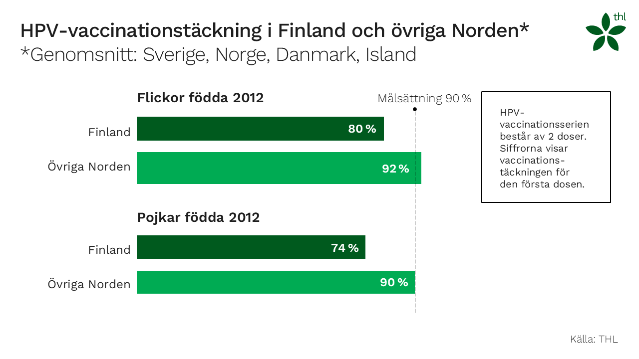 I Finland har 80 procent av flickor födda 2012 och 74 procent av pojkar fått HPV-vaccinet, som förebygger flera cancerformer orsakade av papillomvirus. Målet är en vaccinationstäckning på minst 90 procent för att stoppa virusets spridning i befolkningen och minska förekomsten av HPV-relaterade cancerformer. Detta mål uppnås i nästan alla andra nordiska länder.