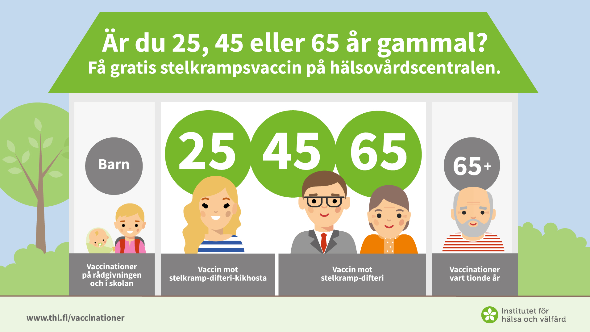 Stelkrampsvaccinet ingår i det nationella vaccinationsprogrammet. Barnen får vaccinet på rådgivningen och i skolan. De vuxna ska själva se till att deras stelkrampsvaccination är i kraft. Skyddet mot stelkramp bör effektiveras med vaccin i åldrarna 25, 45 och 65 år. Dessutom får personer över 65 år vaccin med 10 års mellanrum. Den avgiftsfria vaccinationen fås på hälsovårdscentralen.