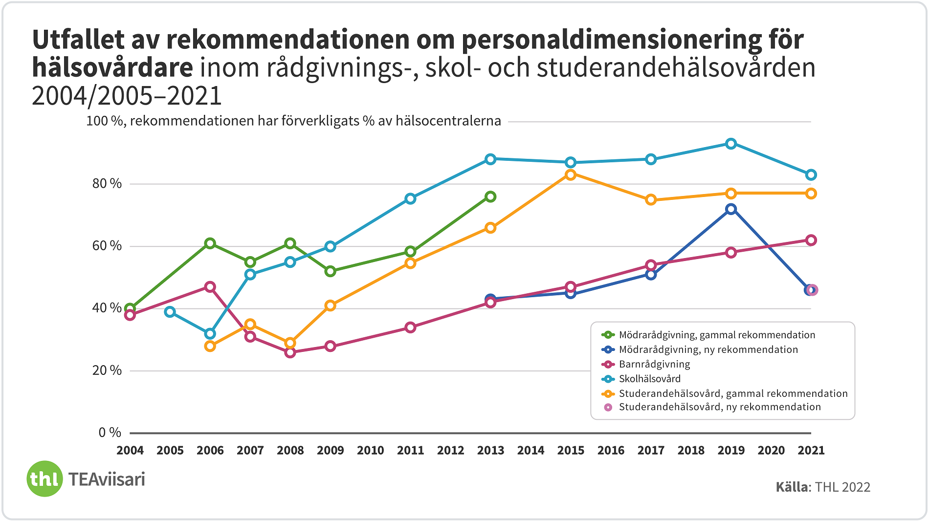 THL har följt upp utvecklingen av antalet hälsovårdare och läkare vid rådgivningarna, skol- och studerandehälsovården och förverkligandet av rekommendationerna för personaldimensioneringen i 17 år sedan 2004 med hjälp av datainsamlingen TEAviisari och separata utredningar. Den förstärkning av personalresurserna som pågått i flera år verkar ha avstannat och utvecklingen började minska i fjol.