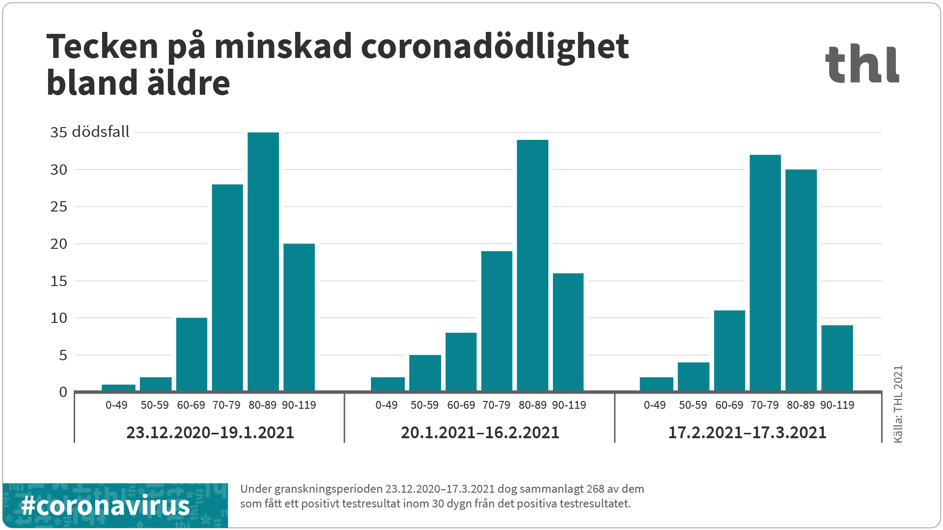 THL utredde dödsfall relaterade till coronavirussjukdomen enligt åldersgrupp. Med dödsfall i samband med covid-19 avses här dödsfall som skett inom 30 dygn efter att man har fått ett positivt coronatestresultat. Granskningen fokuserade på tiden efter början av december 2020 för att ändringarna i provtagningsfrekvensen inte ska påverka värdena och för att situationsutvecklingen under de senaste månaderna ska kunna urskiljas bättre.