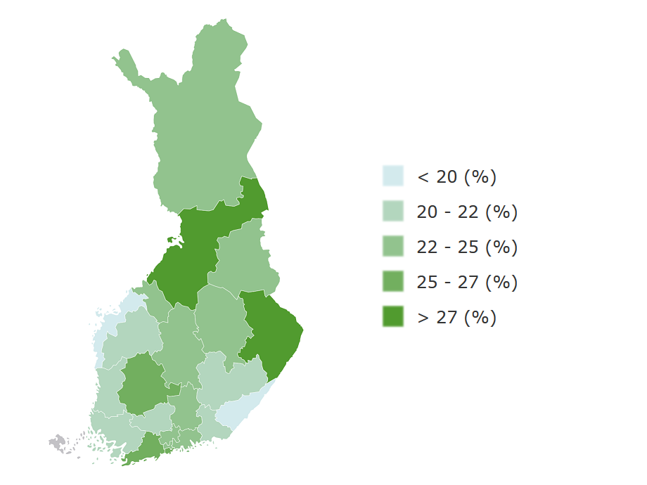 I undersökningen samlar vi in information från 21 välfärdsområden, Helsingfors och Åland. Utöver en lägesbild över nivån i hela Finland möjliggör den insamlade informationen en omfattande regional jämförelse.
