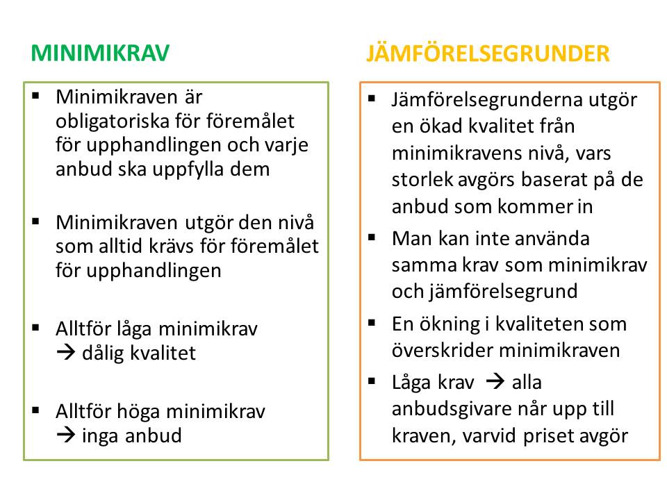 Utöver minimikraven kan man också påverka kvaliteten på servicen genom att fastställa jämförelsegrunder för kvaliteten. Alla anbud måste uppfylla de minimikrav som angetts, men den kvalitet som anbudsgivarna är villiga att erbjuda som överstiger dessa krav bedöms med hjälp av fastställda jämförelsegrunder.