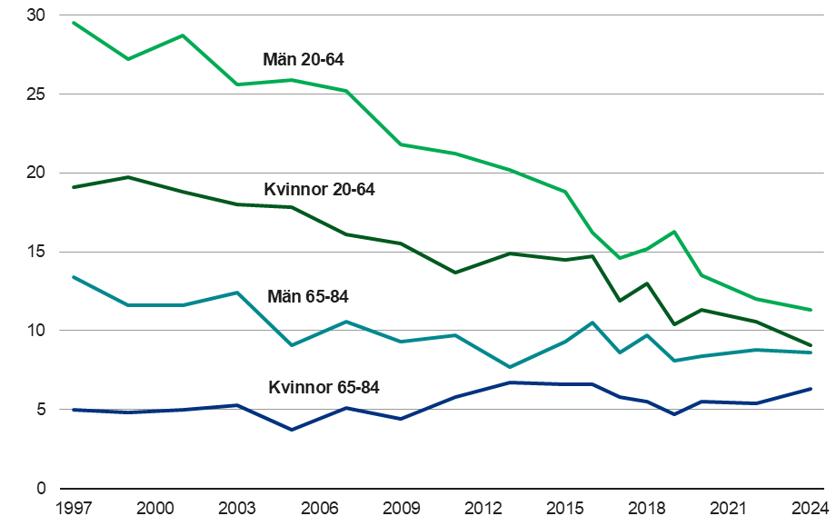 Bland personer i pensionsåldern (65–84-åringar) rökte sex procent av kvinnorna och nio procent av männen dagligen år 2024. Andelen personer i pensionsåldern som använder nikotinpåsar är mycket liten.