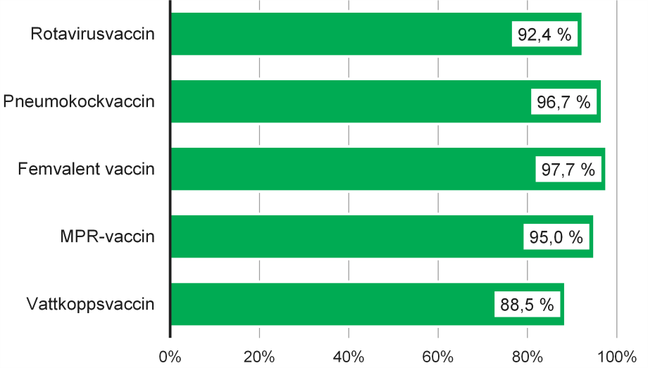 För nästan 98 procent av barnen födda år 2022 inleddes en vaccinat-ionsserie med femvalent vaccin (skydd mot difteri, stelkramp, kikhosta, polio och Hib-sjukdomar). I samma åldersklass inleddes en MPR-vaccinationsserie (skydd mot mässling, påssjuka och röda hund) för cirka 95 procent av barnen.
