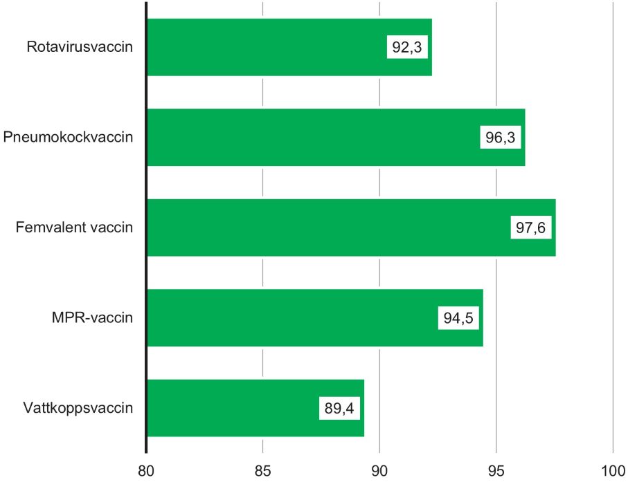 Av de barn som föddes 2023 inleddes den femvalenta vaccinationsserien (som skyddar mot difteri, stelkramp, kikhosta, polio och Hib-sjukdomar) för 97,6 procent. I samma åldersgrupp fick 96,3 procent den första dosen av pneumokockvaccinet.
