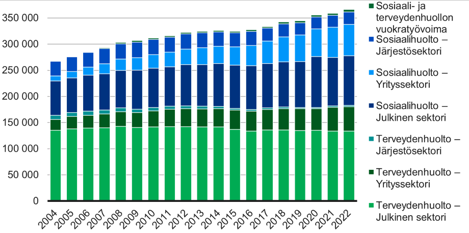 Vuoden 2023 lopussa sosiaali- ja terveyspalveluissa työskenteli yhteensä noin 372 600 henkilöä. Määrä kasvoi 1,7 prosenttia (noin 6 340 henkilöä) vuodesta 2022 ja 8,8 prosenttia (noin 30 000 henkilöä) vuodesta 2018. Henkilöstöstä 49,5 prosenttia työskenteli terveydenhuollossa, 49,1 prosenttia sosiaalihuollossa ja henkilöstövuokrausyritysten kautta 1,3 prosenttia.*