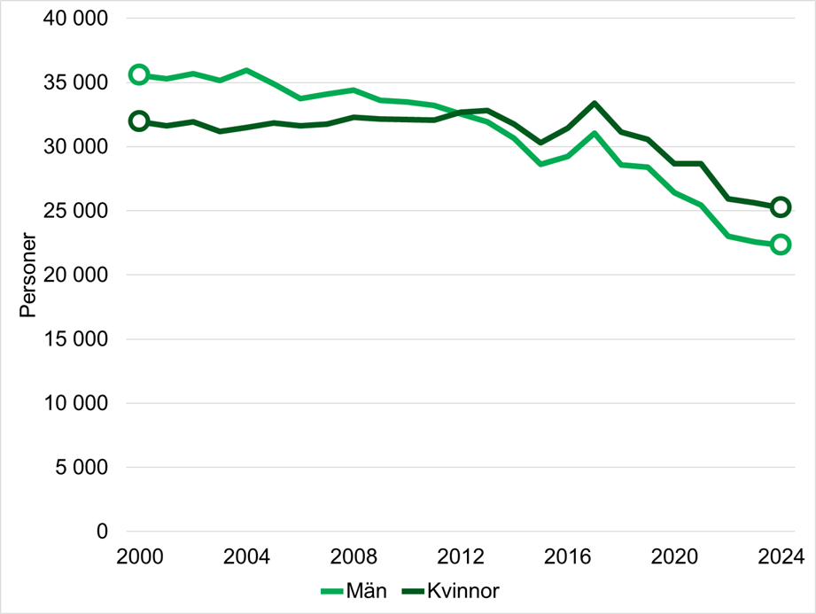 Figur 1: Personer som vårdades på vårdavdelning inom den specialiserade sjukvården på grund av olycksfall 2000–2024.