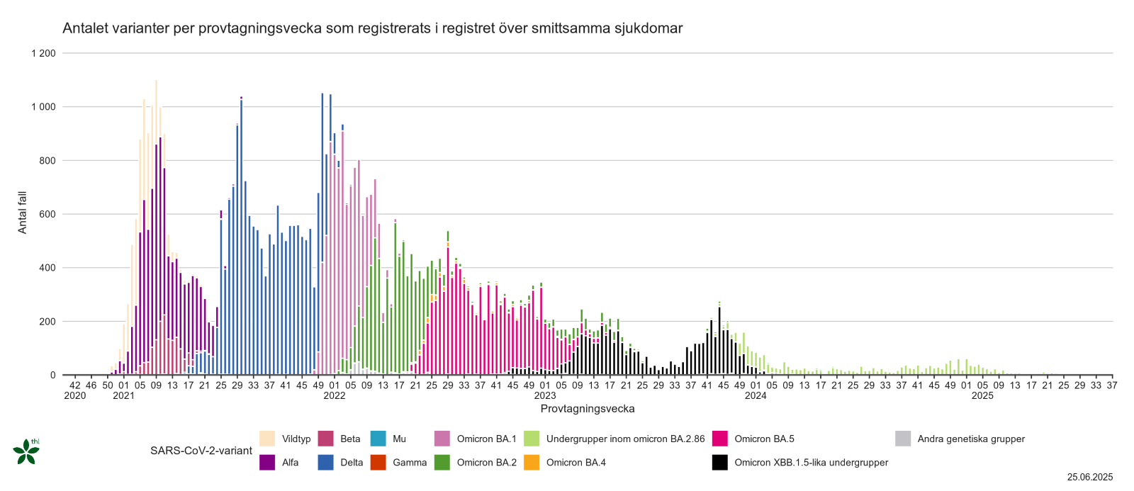 Resultat som baserar sig på sekvensdata och resultat som baserar sig på data från registret över smittsamma sjukdomar kan skilja sig något på grund av raporteringsfördröjningar. Resultaten för den senaste rapporteringsveckan baserar sig ofta på ett relativt litet antal sampel och är därför mindre tillförlitliga än resultat för tidigare veckor.