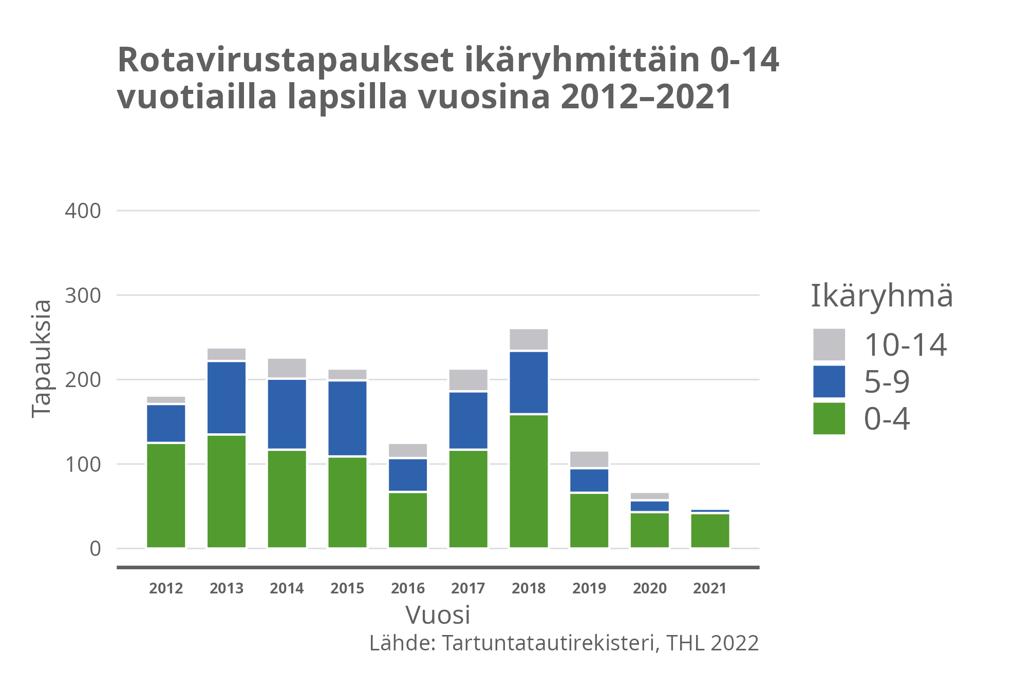 År 2021 rapporterades 85 fall av rotavirus till registret över smittsamma sjukdomar. Antalet har hållit sig under 500 efter att rotavirusvaccinet togs med i det nationella vaccinationsprogrammet 2009.